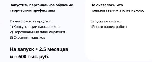 Клиент хотел запустить персональное обучение творческим профессиям (например, графическому дизайну). По плану продукт должен был состоять из консультаций наставников, составления персонального плана обучения и скрининга навыков. На запуск этой идеи было 2,5 месяца и 600 тыс. рублей.