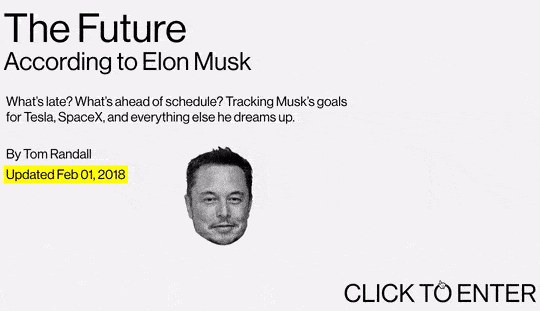 Конечно, есть в предсказаниях Маска то, что кажется маловероятным современному человеку — разработка «мозговых интерфейсов» к 2027 году или колонизация Марса в 2040-м.Журналисты попытались собрать и структурировать все обещания Илона Маска. В 2017 году журнал Entrepreneur опубликовал красочную инфографику с основными планами предпринимателя. Bloomberg пошел дальше и специально для скептиков сделал масштабный спецпроект — The future according to Elon Musk. В нем собрали информацию обо всех прошлых и будущих проектах Маска — и его мечтах, как указано на главной странице.