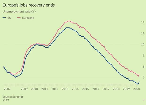 С апреля по май 2020 года работу потеряли около двадцати миллионов европейцев. Лидеры стран ЕС вынуждены тратить огромные суммы на поддержание экономики в стабильном состоянии. Массовые увольнения, а также переход значительной части сотрудников на удалёнку нанесли серьёзный урон экономике Евросоюза. Это подтверждает статистика: около 50% французских работников частного сектора вынуждены были уйти в отпуск без сохранения заработной платы. Треть трудоспособного населения в Ирландии осталась без работы.