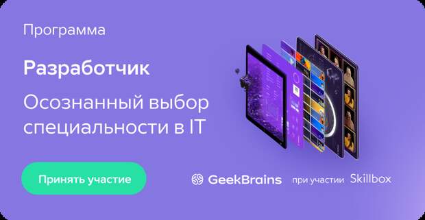 Разработчик — первая Программа обучения для осознанного выбора специальности и карьерной траектории в сфере информационных технологий от GeekBrains при участии Skillbox.